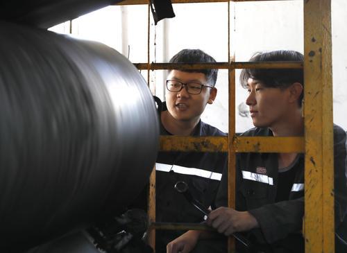 见到郝家乐和赵巍时,他们俩正在设备运转着的皮带机行忙碌着,一个在清理从皮带上洒落的煤,一个在巡视设备运行情况。在高达五层楼的运煤线上,我的不约而至显然出乎他们的意料,带着书生气的脸上礼貌露出的微笑算是给我打了个招呼。机电设备维修与管理专业毕业的他俩目前的工作算是专业对口了。他们刚进矿时,正赶上设备厂家对煤流线进行安装,于是,选煤厂的领导就安排他们协助安装。象拉皮带,扛托辊等活他们都参与过。由于当时正处隆冬季节,刚出校门的他们顶风冒雪,爬高上低,大冬天干的硬是汗流浃背。脏累苦险也曾让他们不适应过,犹豫彷徨过,产生怀疑过,特别是有个别家庭条件好的同学吃不了当时的苦,打起包裹回家了,这些都让他们产生过动摇。但随着时间的推移,赵巍说他现在能够理解领导的良苦用心了。正是当时的全程参与,使得他们熟悉了设备运行的每个环节,能够很快的适应工作,独当一面,领导也才能放心的把854皮带机巷交给郝家乐他俩管理,维修,保养,遇到小问题处理解决也不在话下。