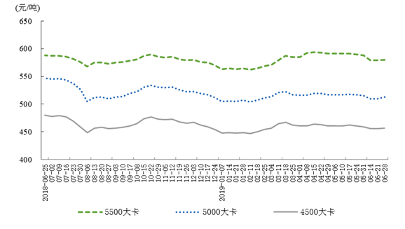 6月28日,秦皇岛5500大卡煤炭综合交易价格为每吨580元,5000大卡为每吨513元,4500大卡为每吨457元,比5月31日分别下跌8元、2元和2元。