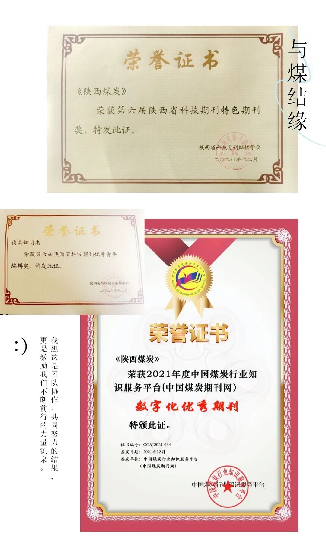 在大家共同努力下,《陕西煤炭》获第五、六届“陕西省科技期刊特色期刊奖”,连年被中国煤炭行业知识服务平台(CCAJ)评为“数字化优秀期刊”,列入地学、煤炭领域高质量科技期刊,加入OSID开放科学计划。主编王成祥被中国煤炭学会聘任为“中国煤炭学会第二届学术期刊工作委员会委员”。我个人也得到了很大的提升,获得第六届陕西省科技期刊优秀青年编辑奖,被评为全省优秀文学工作者。我想这是团队协作、共同努力的结果,更是激励我们不断前行的力量源泉。
